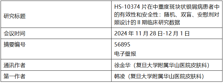 2024年11月29日,k豆钱包有限公司(以下简称“k豆钱包”,03692.HK)宣布,公司自主研发的一种口服、TYK2选择性变构抑制剂——HS-10374,用于治疗中重度斑块状银屑病的Ⅱ期临床研究数据,在十九届中国医师协会皮肤科医师年会暨全国美容皮肤科学大会(CDA 2024,武汉,2024.11.28~2024.12.01)上以电子壁报形式发布。